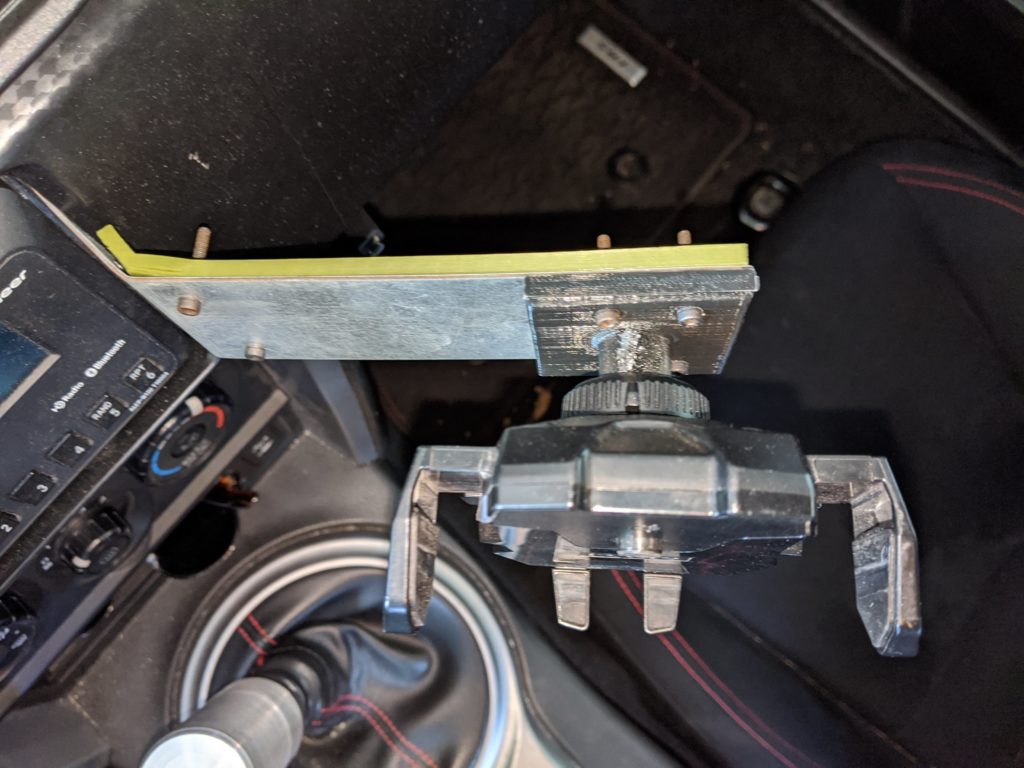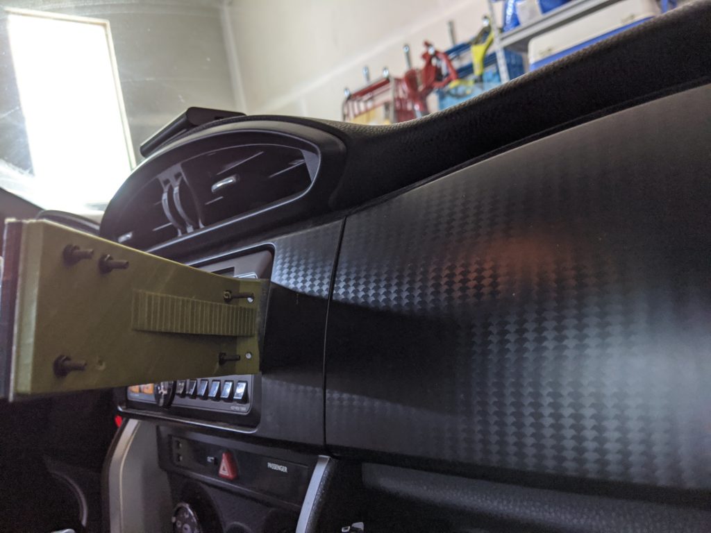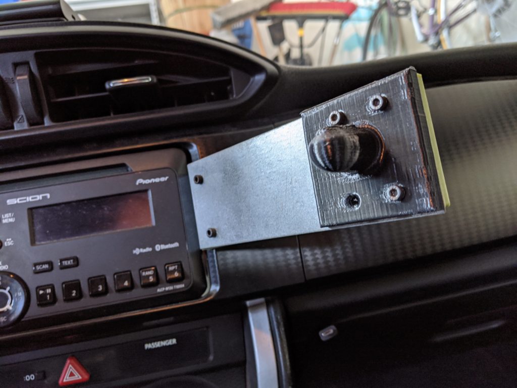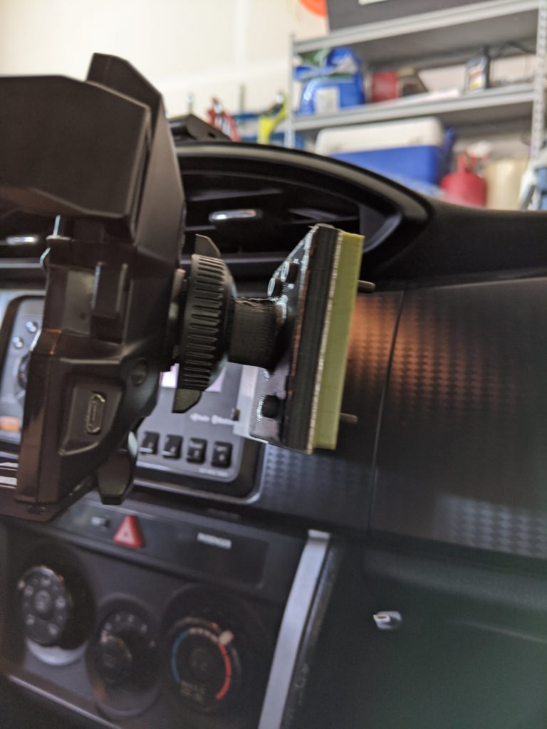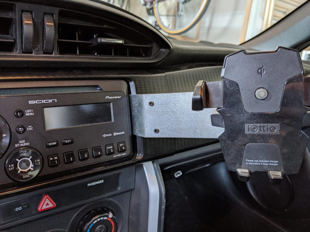 I decided to mount a sheet metal plate to the radio behind the dashboard and to bolt a 3d printed ball mount onto which I clamped an off-the-shelf phone clamp. Because of the implementation of the ball mounted clamp, the phone mount retained its freedom of rotation and catered to my needs perfectly.